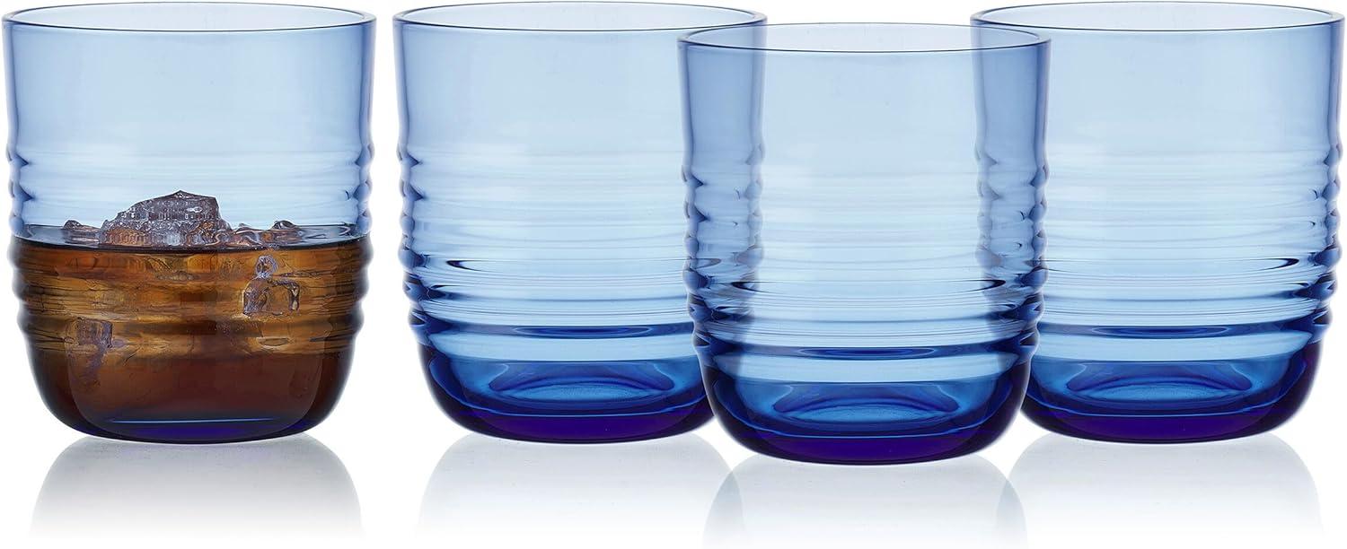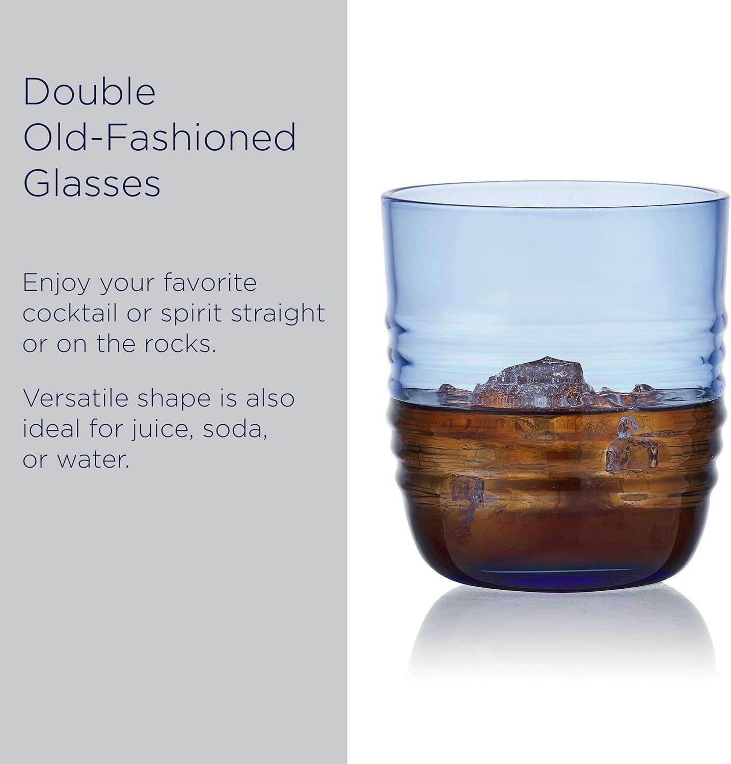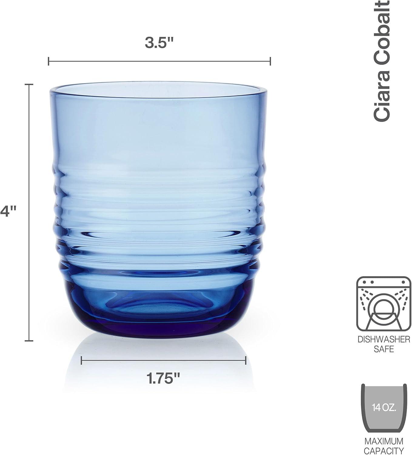 Simple and stylish, this Ciara Set of 4 Double Old-Fashioned Cobalt Glasses are ideal for elevating any occasion. Made of high-quality, lead-free glass, each glass features cobalt colored glass with a thick base and a contemporary, soft ribbing design to bring texture to your tabletop display. Perfect for enjoying a variety of beverages, these double old-fashioned glasses have wide openings, making adding ice for cold drinks easy, and they complement any flatware or dinnerware. Set of 4 glasses, each measuring 4-inches tall by 3-1/2 inches in diameter with a 14-fluid ounce capacity. Dishwasher safe.