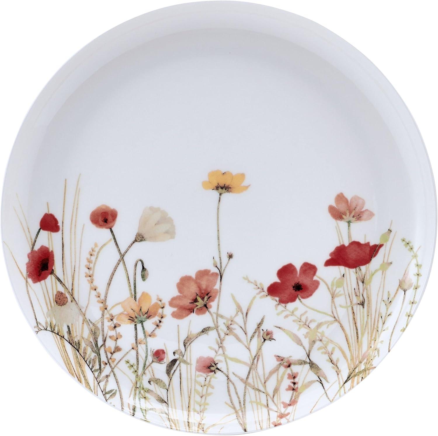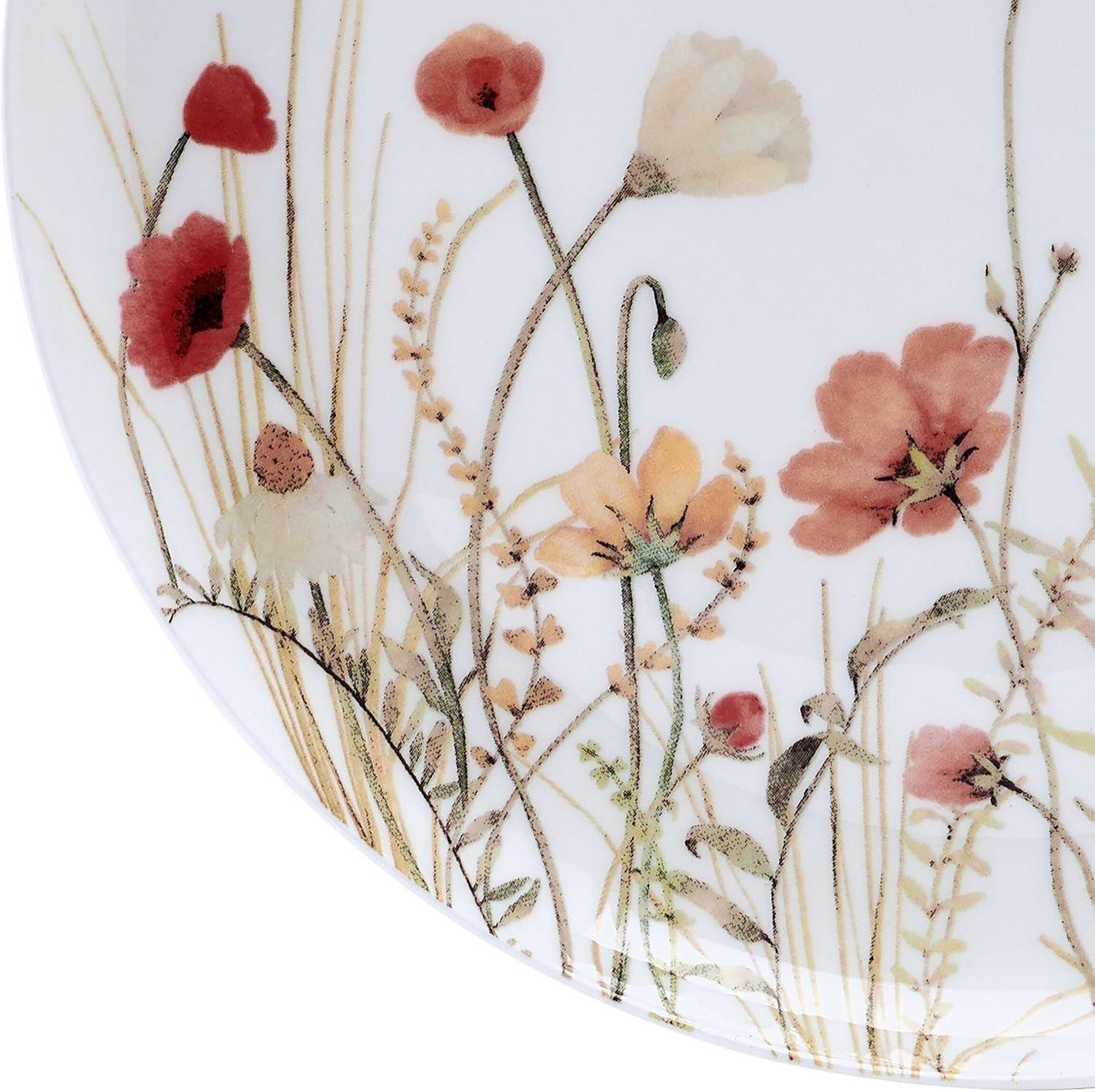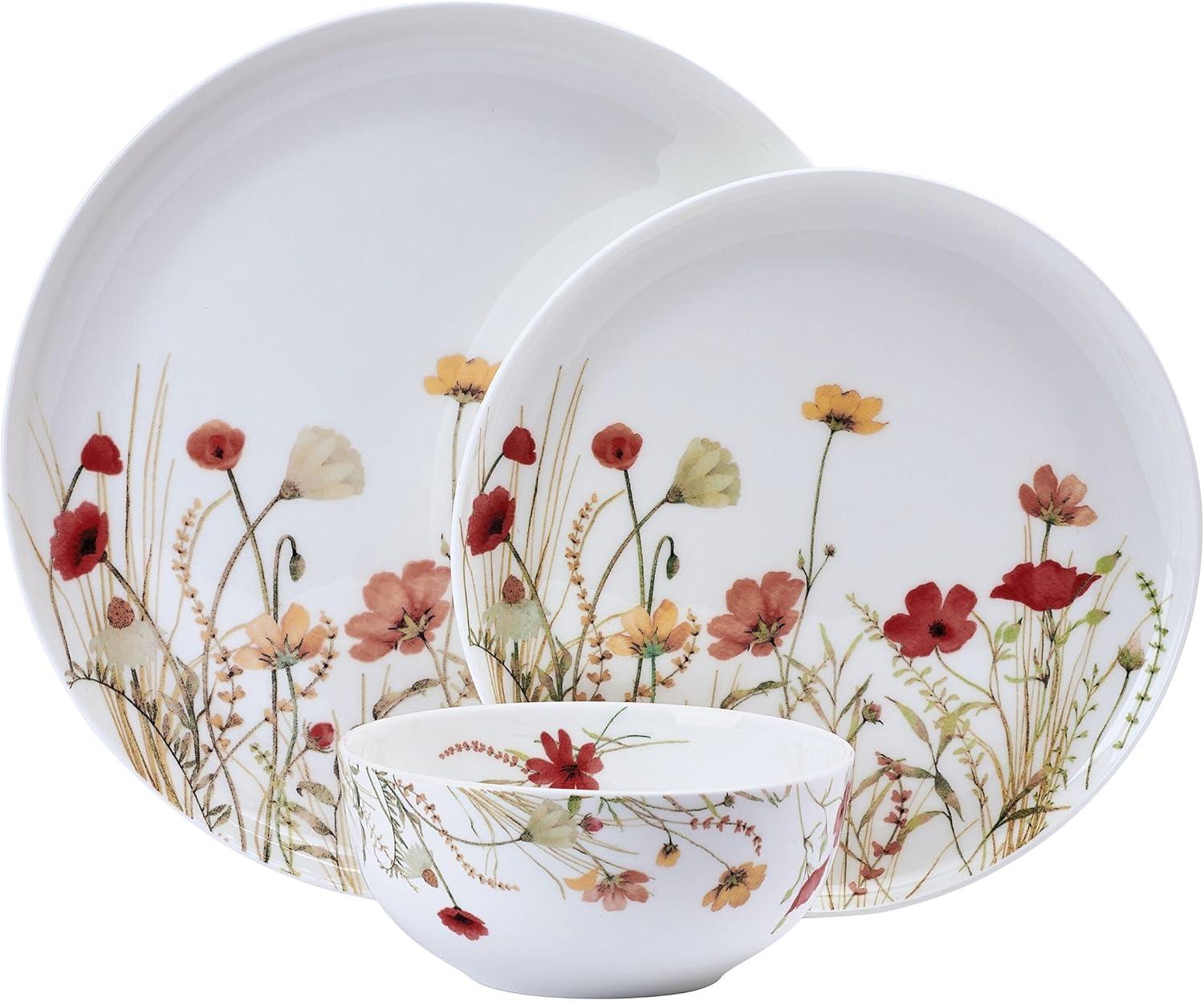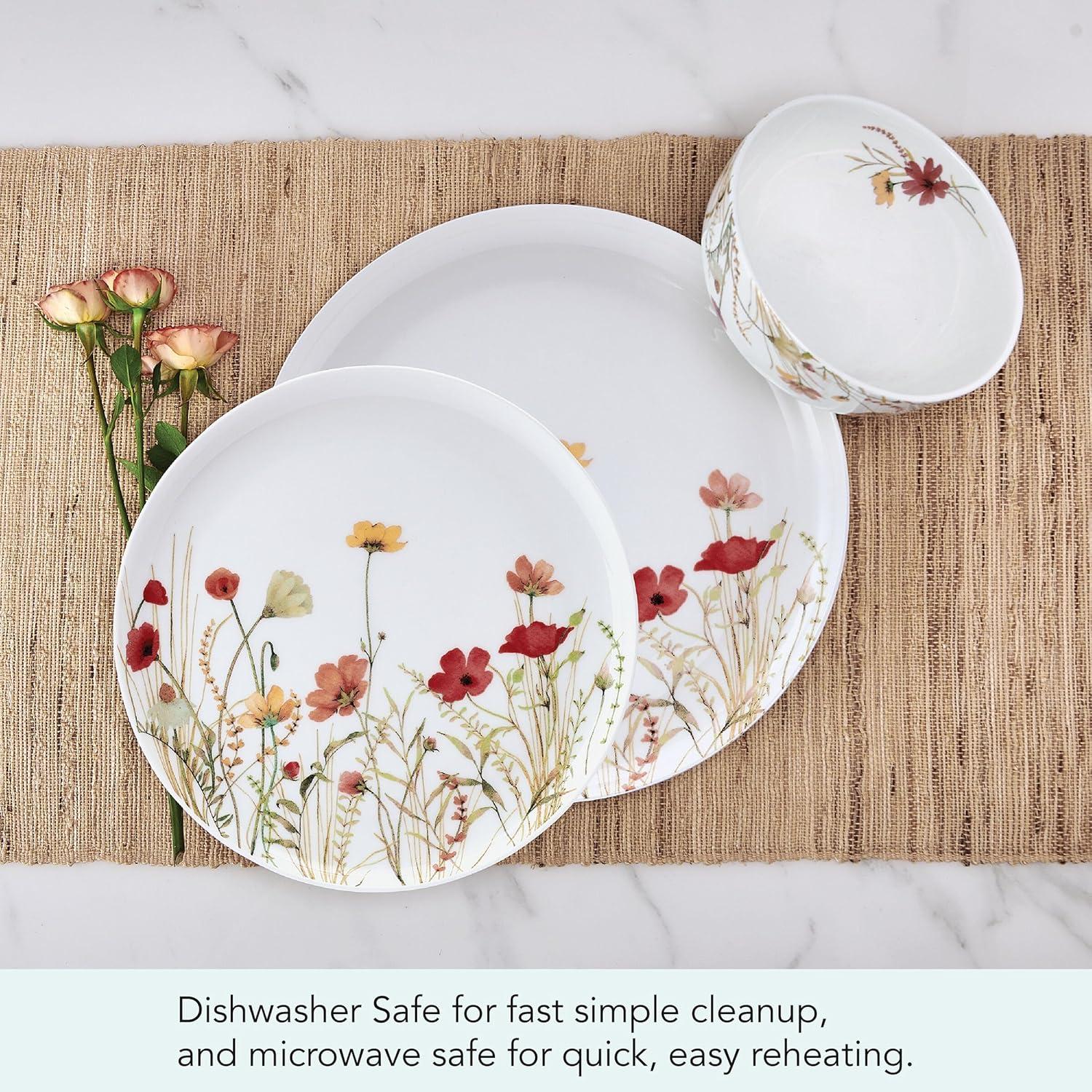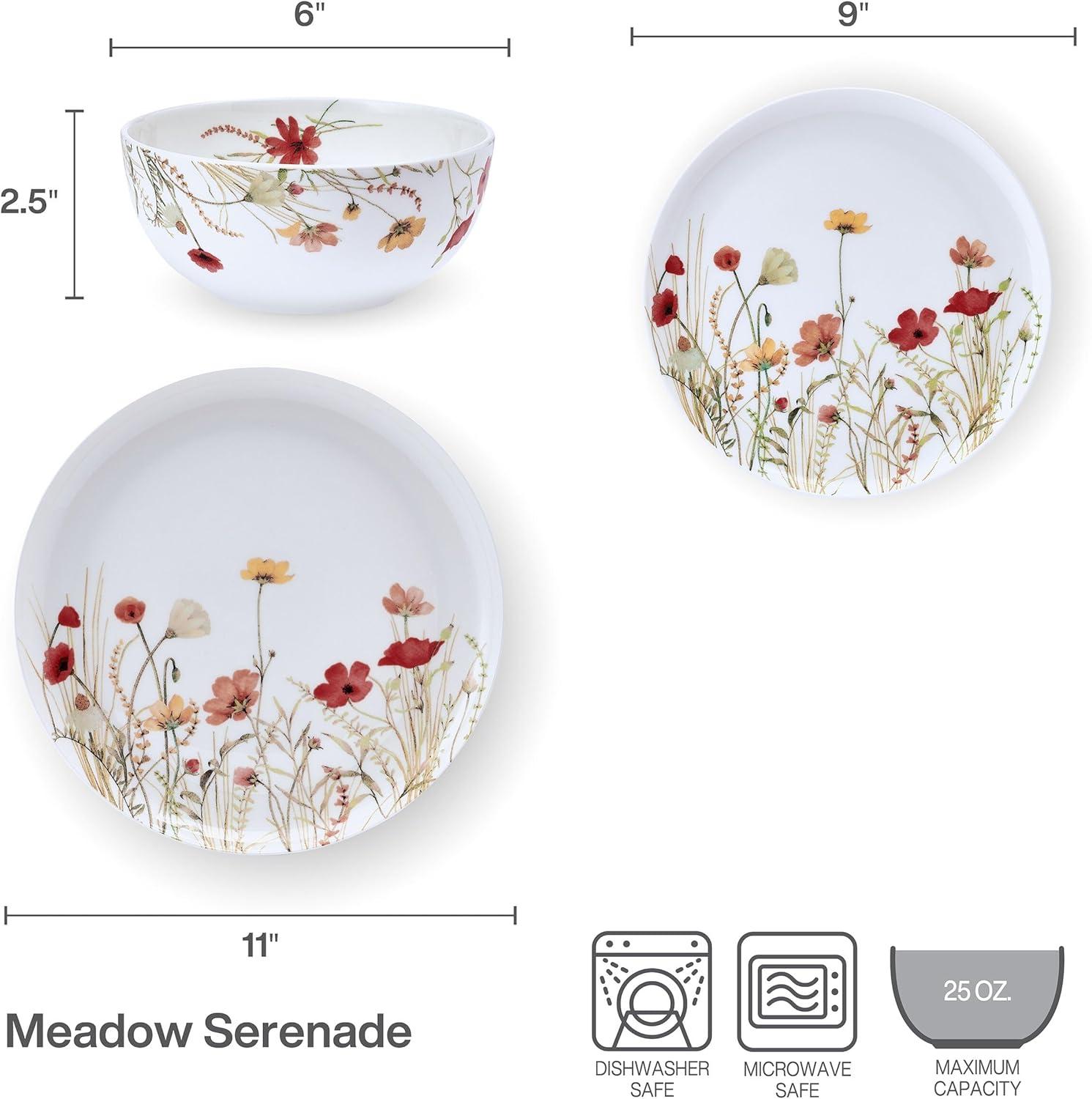 Brighten your tabletop with the contemporary elegance of this Meadow Serenade 12-Piece Dinnerware Set by Mikasa. Beautifully crafted of high-quality bone china for long-lasting durability, vibrant collection is adorned with a vivid watercolor flower pattern that dances across the surface of each piece. The orange, yellow, red, and green color palette pops on any dining table and is perfect for livening up your casual dinner gatherings. 12-piece set, service for 4, includes 4 each of: 11-inch dinner plate, 9-inch salad plate, and 2-3/4 inch high by 6-inch diameter all-purpose bowl with a 33-fluid ounce capacity. Microwave and dishwasher safe.