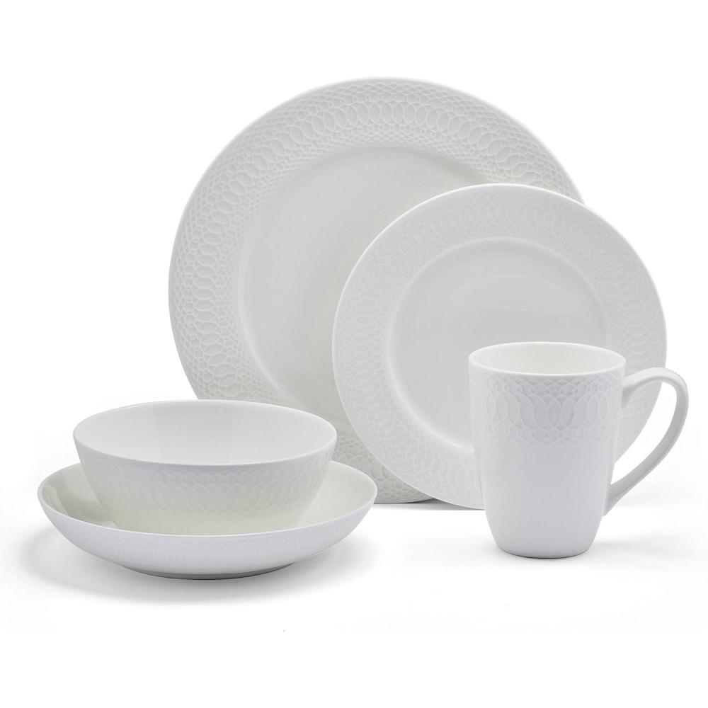 Bring a touch of sophistication to any table setting with the modern simplicity of this Samantha 40-Piece Dinnerware Set by Mikasa. Stunningly crafted of high-quality bone china for long-lasting durability, this sleek and elegant set elevates any occasion with minimalist style, contemporary curves, and smooth surfaces, and the basic white color complements any flatware or stemware. 40-piece set, service for 8, includes 8 each of: 10-1/2 inch dinner plate, 8-inch salad plate, 6-inch cereal bowl, 4-1/4 inch fruit bowl, and a 16-fluid ounce mug that is 4″ high. Microwave and dishwasher safe.