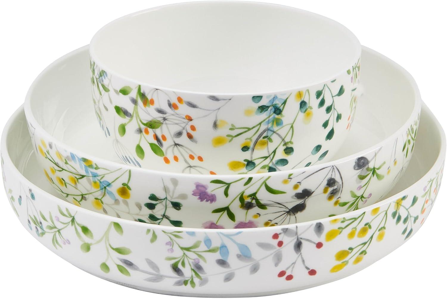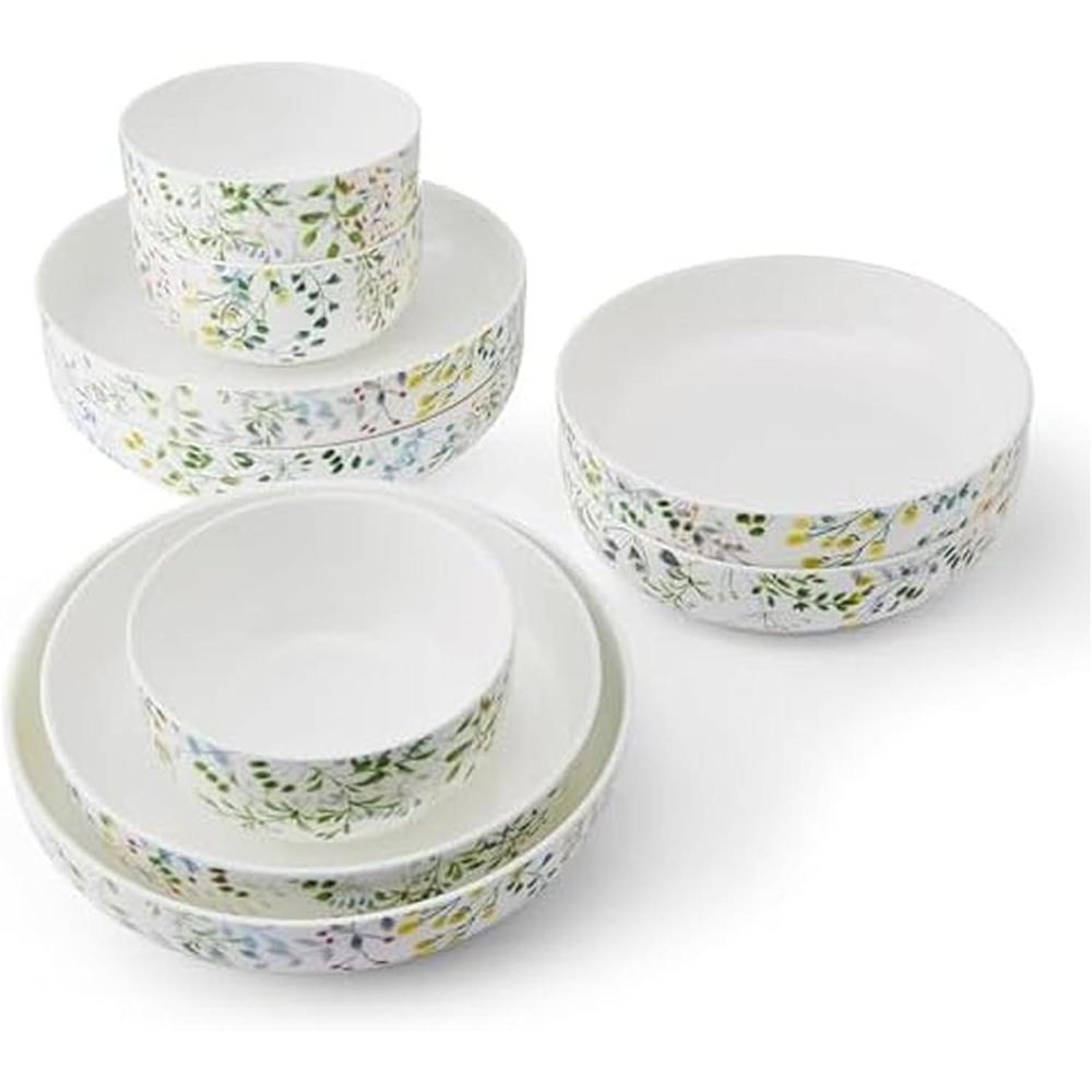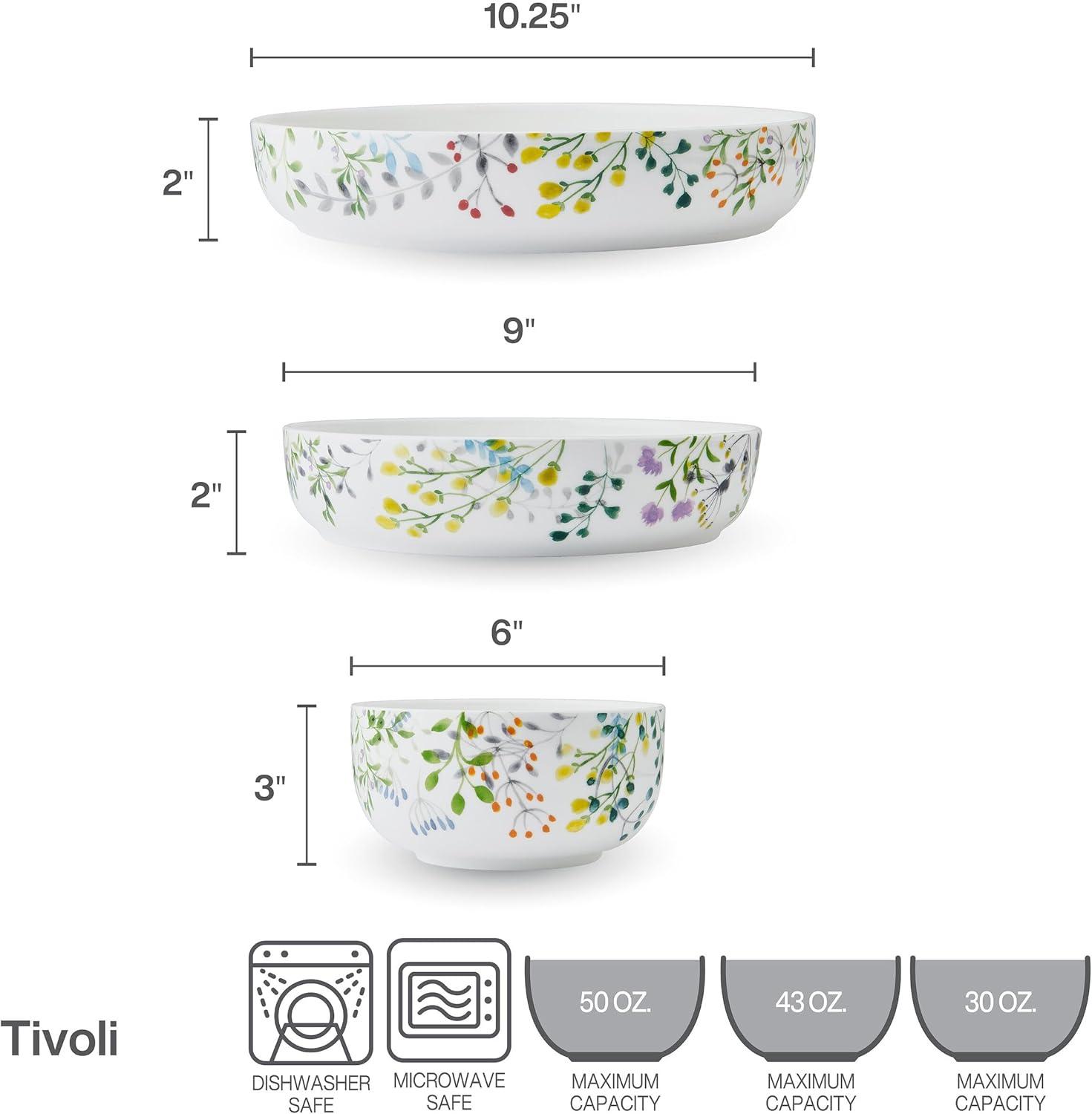 Defy expectations with this Tivoli Garden 9-Piece Dinnerware Bowl Set by Mikasa. Made of high-quality bone china for long-lasting durability, these Tivoli Garden dining bowls feature a modern, walled design, with a color splash of delicate florals encircling each piece. Each bowl is sized and shaped for specific serving needs to add visual interest to your tablescape. The 9-piece set includes 3 of each: 10-1/4 inch diameter by 2-inch high dinner bowl with a 50-fluid ounce capacity, 9-inch diameter by 2-inch high pasta bowl with a 43-fluid ounce capacity, and 6-inch diameter by 3-inch high all-purpose bowl with a 30-fluid ounce capacity. Microwave, oven, and dishwasher safe.