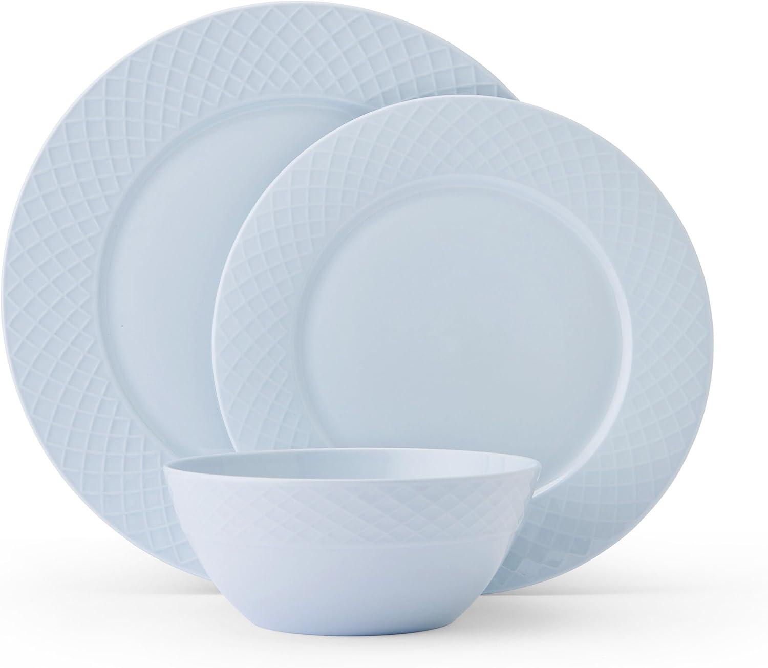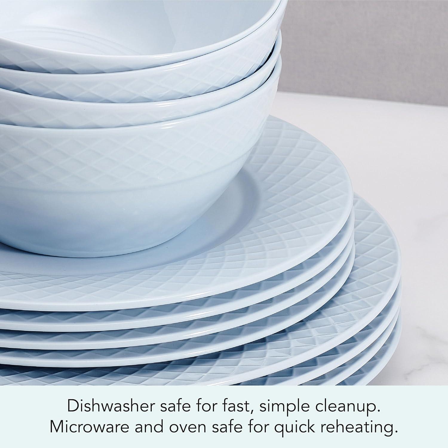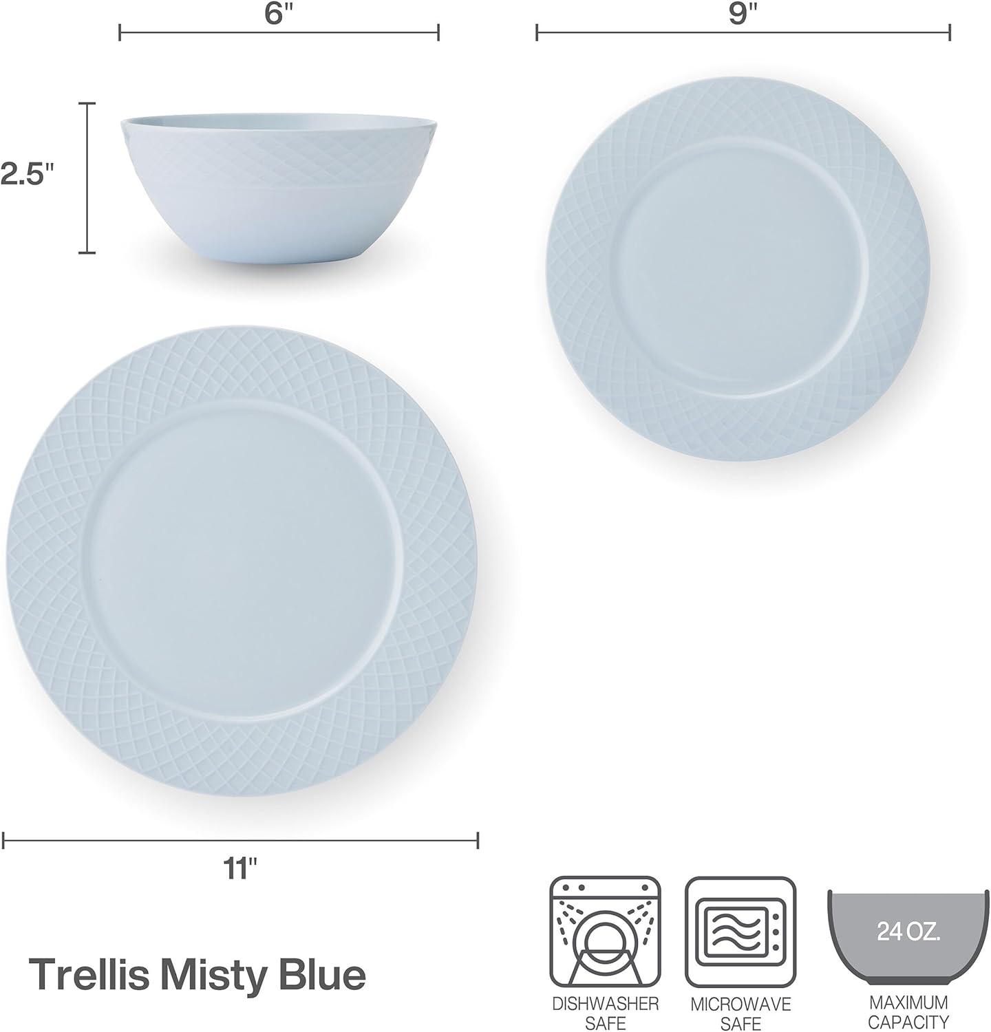 Warm and inviting, this Trellis 12-Piece Misty Blue Dinnerware Set by Mikasa is beautifully crafted of lightweight, high-quality bone china, with a tranquil blue color and a distinct, crosshatch trellis design around the rims. Timeless and charming, this collection is perfect for both everyday dining and casual entertaining. 12-piece set, service for 4, includes 4 each of: 11-inch dinner plate, 9-inch salad plate, and 2-1/2 inch high by 6-inch diameter cereal bowl with a 24-fluid ounce capacity. Oven, freezer, microwave, and dishwasher safe.