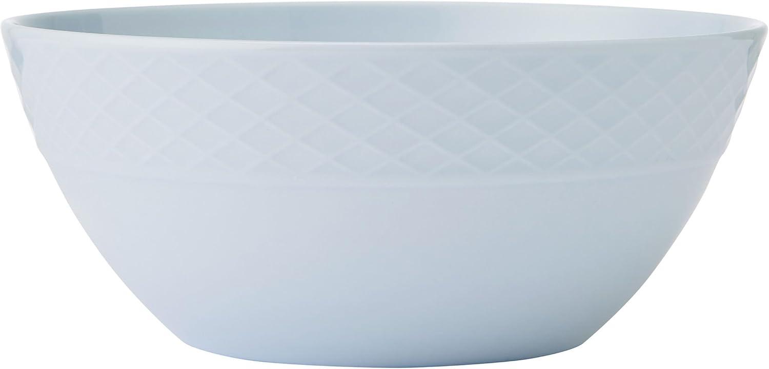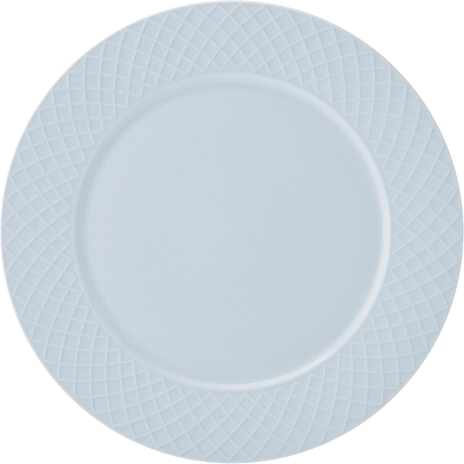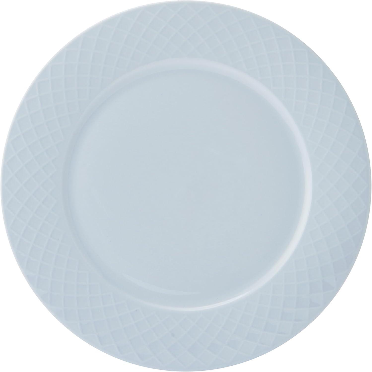 Warm and inviting, this Trellis 12-Piece Misty Blue Dinnerware Set by Mikasa is beautifully crafted of lightweight, high-quality bone china, with a tranquil blue color and a distinct, crosshatch trellis design around the rims. Timeless and charming, this collection is perfect for both everyday dining and casual entertaining. 12-piece set, service for 4, includes 4 each of: 11-inch dinner plate, 9-inch salad plate, and 2-1/2 inch high by 6-inch diameter cereal bowl with a 24-fluid ounce capacity. Oven, freezer, microwave, and dishwasher safe.