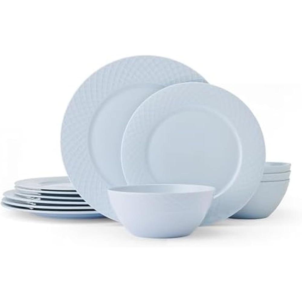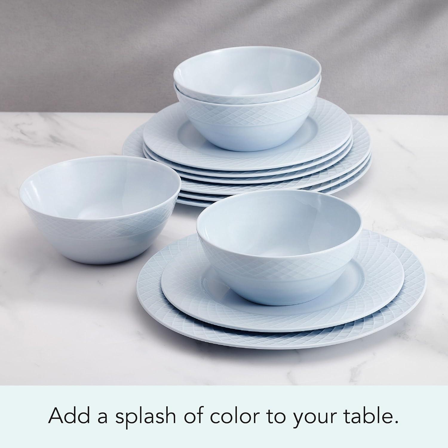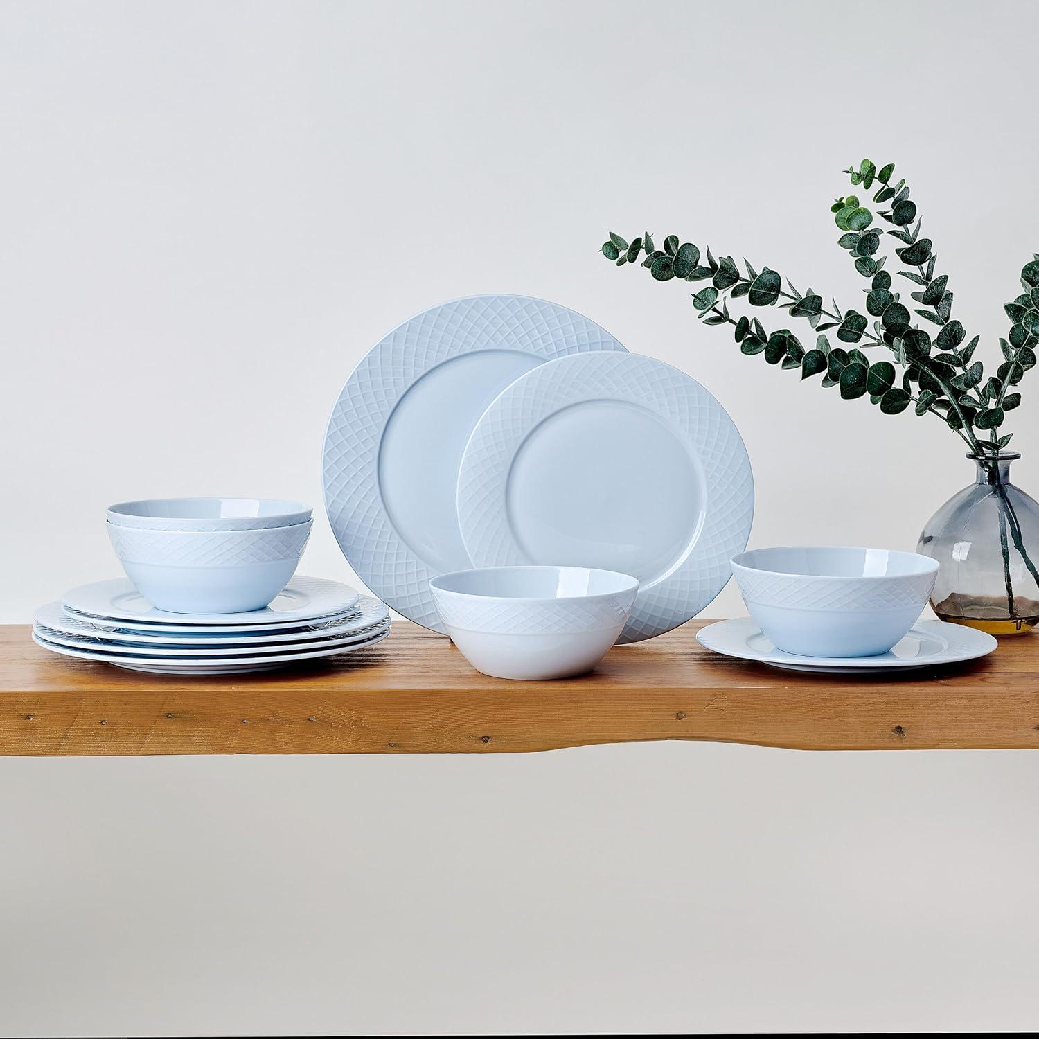 Mikasa Trellis Pastel Bone China Lightweight Chip Resistant 12 Piece Dinnerware Set, Service for 4, Misty Blue